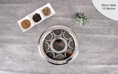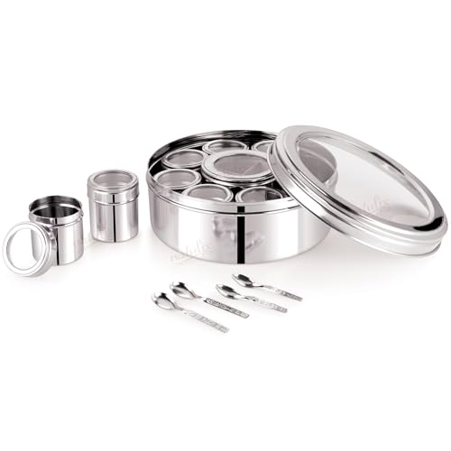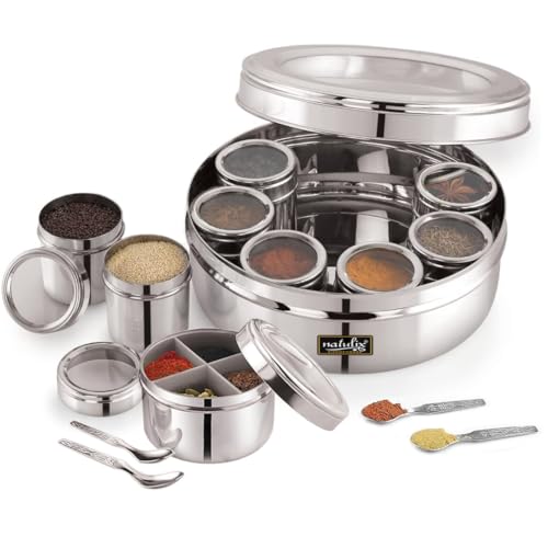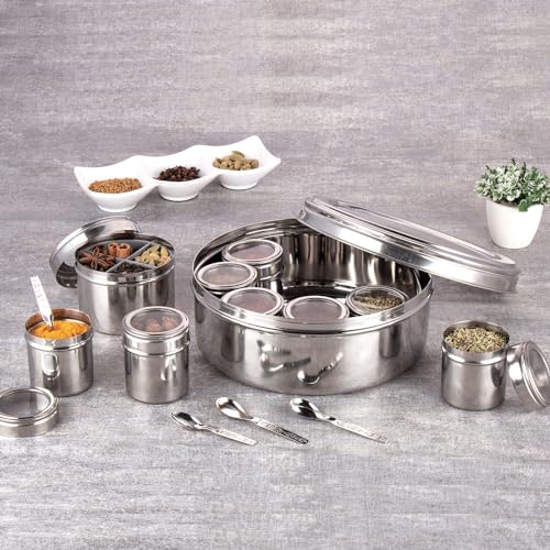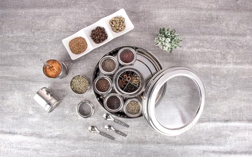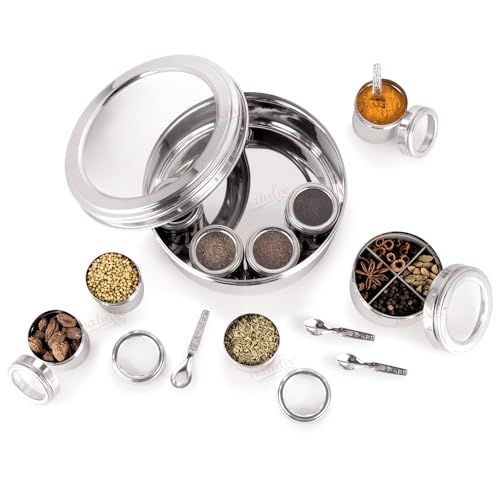 This masala box comes with 9 inner containers (8 small & 1 large with middle partition) with individual lids on it, which prevent mixing of masala/ spices.