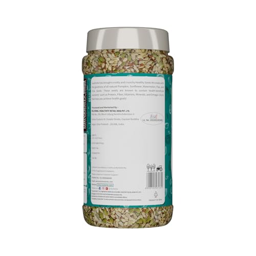 5-in-1 Seeds Mix: Nutritional goodness of Pumpkin, Watermelon, Sunflower, Flax & Chia seeds which are rich in zinc, magnesium, protein, vitamin E, omega-3 fatty acids, & fiber for your overall well-being.