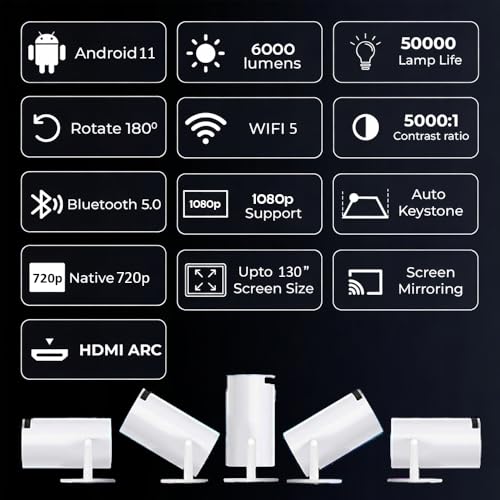【Built-in Dual Band WiFi & Portable Projector with 180° Rotation】No need to fix the installation. The projection angle and projection of the ceiling can be adjusted flexibly. Regardless of the environment. Built-in 5g dual-frequency WiFi 5, with lower latency and faster response, is an ideal choice for video conferencing and real-time applications. Thus, you can experience a fluid and immersive experience, without delays or delays.