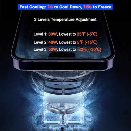 ❄️ [ 50W Fast Phone Cooling ] This phone cooler cooling pad could freeze in 15 seconds. 50W peak power output, it can drastically drop the temperature 60℃(140°F), maximum temperature drop up to -35℃(-31°F) in a 25°C room. 3 temperature control models with dual core temperature control chip, it will help you easily cope with any situations in different temperature environments