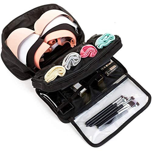 THREEPLY VERSATILE DESIGN: 3 zippered compartments,the main compartment can fit up to 5 bras or other bulky items, the top pocket is ideal for your makeup, blinker, diposable toiletries and underwears, the bottom design adds more space for your travel accessories.