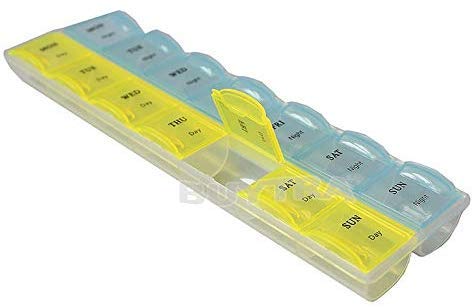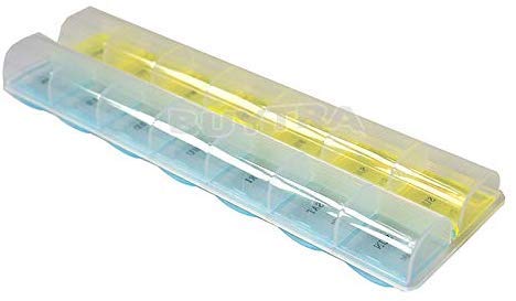 14 dual-color compartments with easy “Snap-on” lids – easy pill organizing into AM/PM.