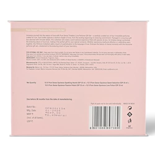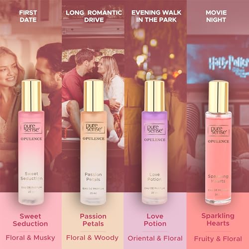 Pure Sense Opulence signature gift box contains four unisex, long-lasting perfumes – Sweet Seduction, Passion Petals, Love Potion, and Sparkling Hearts. This gift box is an ideal gift for a loved one or a perfect way to pamper yourself and your partner with unforgettable fragrances bound to turn heads.