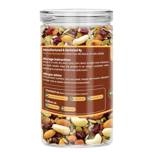 Rich in protein, omega-3Natural Energy Booster: With cashews, almonds, and dry dates providing plant-based protein and healthy fats, and black raisins and cranberries offering natural sugars, this snack delivers sustained energy to keep you active throughout the day.
