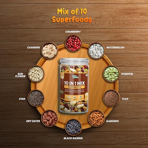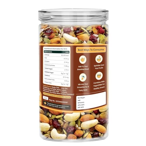 Power-Packed Blend of Ingredients: Made with premium-quality sunflower seeds, pumpkin seeds, chia seeds, flax seeds, watermelon seeds, cashews, almonds, black raisins, cranberries, and dry dates, this mix combines the perfect balance of nutrition and taste.