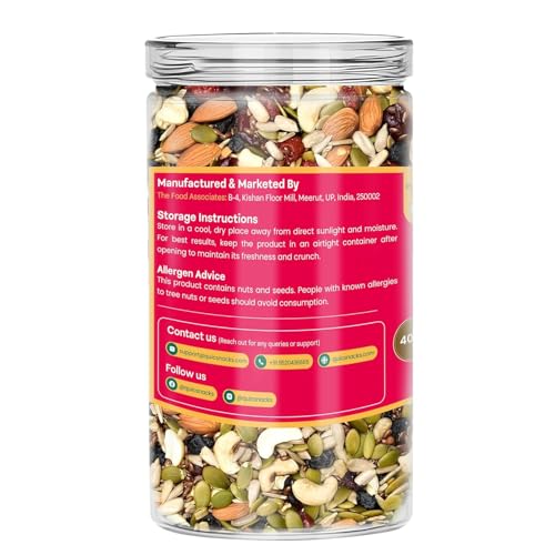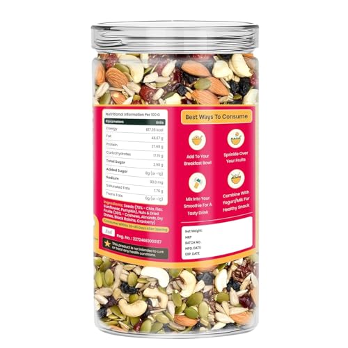 Crunchy & Nutritious: Enjoy a perfect blend of chia seeds, flax seeds, sunflower seeds, pumpkin seeds, almonds, cashews, and dry fruits, offering a crunchy texture and nutrient-dense snack.
