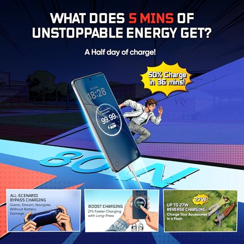 10001mAh Battery with 80W Fast Charge: 80W fast charge powers 50% in 36 mins, with silicon-carbon tech, TÜV Rheinland certification, bypass & reverse charging for reliable performance.