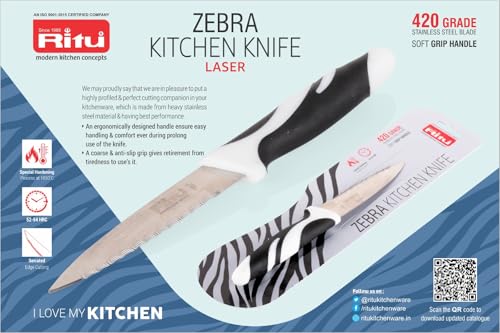 The RITU stainless steel zebra Laser Blade Kitchen Knife is a must -have tool for every kitchen, combining durability, comfort, and precision in one sleek design. Made from high -quality 420 -grade stainless steel, it offers long -lasting sharpness and corrosion resistance for daily use. The plain -edge 8 -inch blade ensures clean, efficient slicing, chopping, and carving of vegetables, fruits, and meats. Its soft, ergonomic handle provides a firm, non -slip grip, reducing fatigue during extended use. Ideal for both home cooks and professionals, this knife delivers top performance with safety and control. The lightweight construction adds to its ease of handling, while the smooth surface allows for quick and hygienic cleaning. Whether you’re preparing everyday meals or hosting special gatherings, this multipurpose knife adds value to your kitchen tools with its strength, balance, and versatility. An essential for effortless, precise, and reliable cutting tasks.