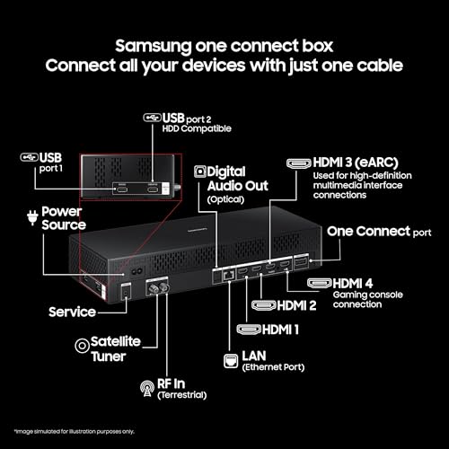 Connectivity : Experience seamless connectivity with Wi-Fi, Bluetooth, 4 HDMI ports, HDMI eARC, Anynet+ (HDMI-CEC), 2 USB-A, 1 USB-C, Ethernet (LAN), Digital Audio Out (Optical), RF In, and Ex-Link (RS-232C)—all conveniently housed in the Samsung One Connect Box for a clutter-free setup.