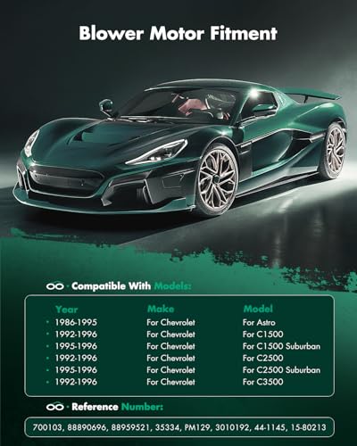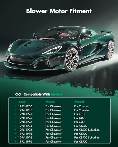 【FITMENT】: the Heater Blower Motor fit for 1992-1996 for Chevrolet C1500 /1995-1996 for Chevrolet C1500 Suburban /1992-1996 for Chevrolet C2500 /1995-1996 for Chevrolet C2500 Suburban /1992-1996 for Chevrolet C3500 /1978-1996 for Chevrolet G30 /1992-1996 for Chevrolet K1500 /1995-1996 for Chevrolet K1500 Suburban