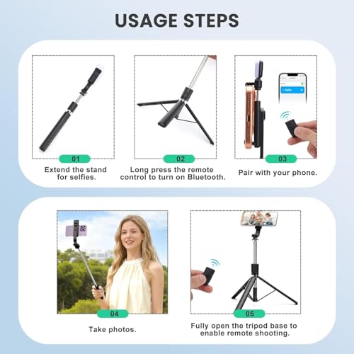 AMBLIC selfie stick tripod with built-in light offers 2 adjustable brightness levels in White Light mode, ensuring clear and well-balanced lighting in any setting. Easily enhance your selfies and videos with lighting control right at your fingertips.