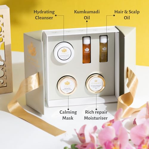 Active Ingredients: Kumkumadi Oil with Saffron refines and rejuvenates skin cells, Hair and Scalp Oil contains Bhringraj and Avocado Oil for intense nourishment
