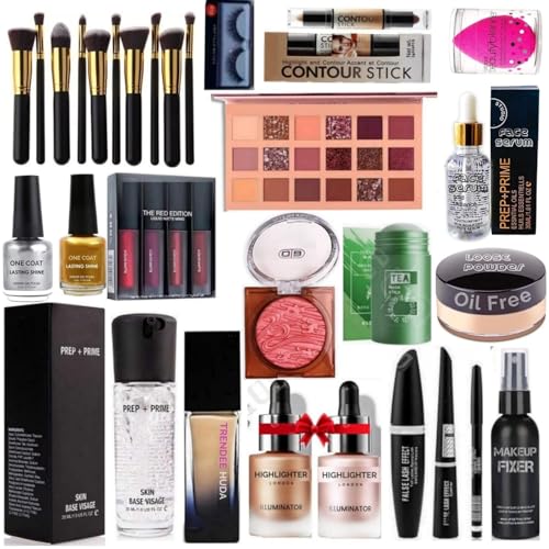 Waterproof Foundation,Waterproof Primer,Waterproof Highlighter,Waterproof Eyeliner,Waterproof Mascara,Eyebrow Pencil,Makeup Fixer,Oil Free Loose Powder,Mask Stick,Makeup Blusher,Waterproof Liquid Lipstick,Golden Silver Nail Polish,Face Serum,Waterproof 18 Shades Nude Eyeshdow,Contour Stick,Eyelashes,Makeup Puff Blender With 12 Pc Makeup Brushes For All Type Of Makeup (SET OF 20)