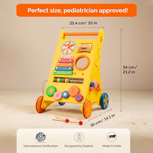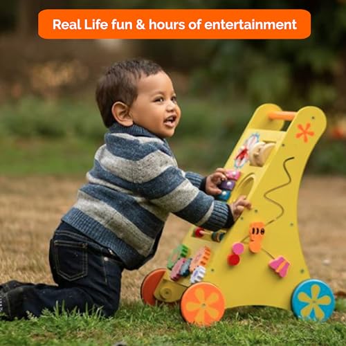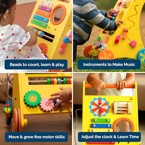 Includes Multiple Activities: Walker with Adjustable clock, Xylophone, Abacus, Movable Gears, Cushioned wheels, Maze, Storage Sapce & Turning drum