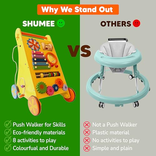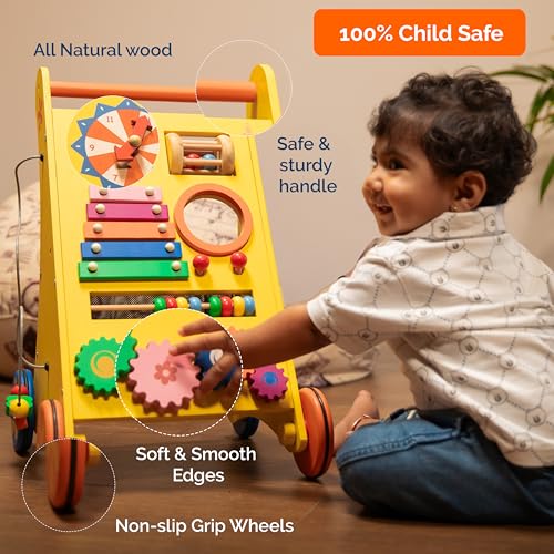 Ergonomically designed: Anti-skid 8 in 1 wooden musical walker for babies, made with organic wooden and non toxic materials.