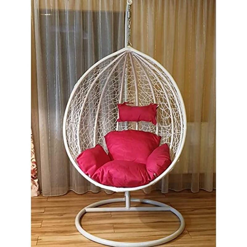 STAND AND CUSHIONS ARE INCLUDED: Never worry about maintenance with this hanging chair patio set. The Ratan Wicker and iron swing seater is protected with finishing to resist the suns heat and rain. Our cushions are tough, yet soft with cushioned seating and Ratan Wicker material, your guests can sit back and relax with luxury accommodation. Our cushions are made with moshi cloth and poly fillers for the perfect snug. The chair takes minimal area cover.