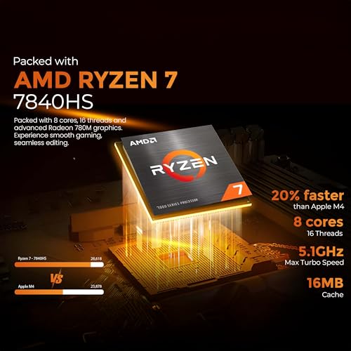 Dominate your tasks with the AMD Ryzen 7 7840HS. Featuring 8 Cores, 16 Threads, and a Max Turbo Speed of 5.1 GHz, this CPU delivers outstanding performance for creation and gaming. Powered by advanced Radeon 780M graphics. Benchmarks show it’s 20% faster than Apple M4