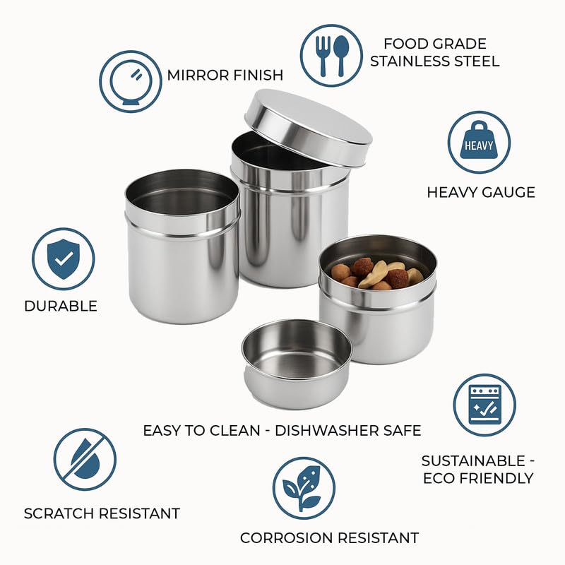 DURABLE STAINLESS STEEL FOR LONG TERM USE Crafted from high quality stainless steel these containers are rust resistant sturdy and built to last. They are designed to handle everyday use in the kitchen without bending staining or absorbing food odors making them ideal for long term storage.