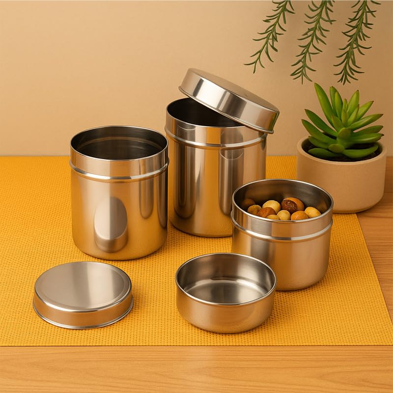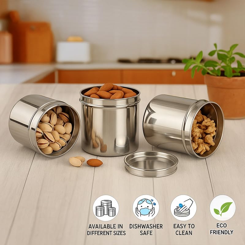 SET OF THREE CONTAINERS FOR FLEXIBLE STORAGE This set includes three stainless steel containers with capacities of 140ml 250ml and 500ml allowing you to store a variety of items in different quantities. Ideal for spices dry fruits snacks or leftovers this compact set meets your daily kitchen storage needs while saving space in your cabinets.