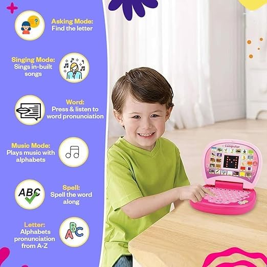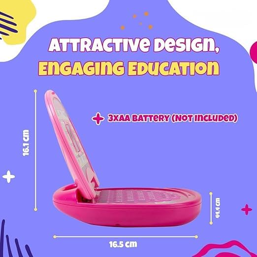 Realistic laptop design with an interactive keyboard helps children become familiar with computer layouts and functions; preparing them for digital literacy in a playful manner.