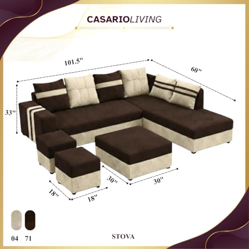 Stova Luxe Velvet-Suede Fabric 8 Seater RHS Sofa Set | with 2 Ottomans& Centre Table| Comfortable & Spacious Seating | Modern Sofa Set for Living Room – Dark Brown & Cream