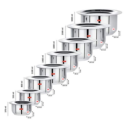 Material: Stainless Steel; Capacity: 370ML, 550ML, 800ML, 1100ML,1400ML, 1800ML, 2300ML, 3000ML; Dimensions: Tope with Lid No. 7 12x12x5.5 cm, No. 8 13.4×13.4×6.7 cm,No. 9 15x15x7.5 cm, No. 10 16.6×16.6×8.2 cm, No. 11 18x18x9 cm, No. 12 19.5×19.5×9.8 cm, No. 13 21.1×21.1×10.5 cm, No. 14 22.6×22.6×11.2 cm