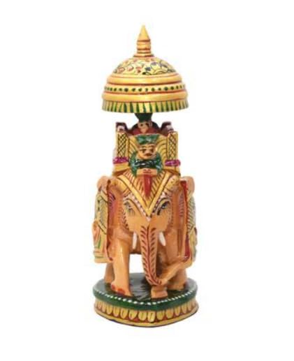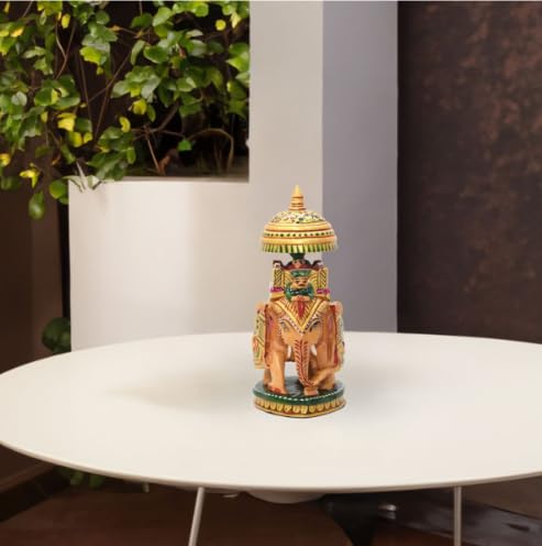 Exquisite Handcrafted Artwork: Beautifully carved white wood elephant with a royal rider and canopy, hand-painted in vibrant traditional colors for an elegant ethnic appeal.