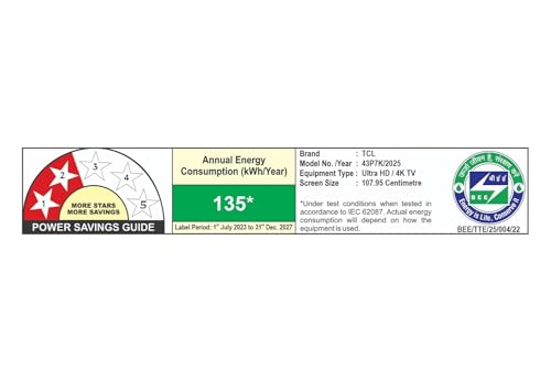 Smart TV Features: 4K QLED Google TV |2GB RAM | 16GB ROM | 64-bit Quad Core Processor| WIFI 5 | Game Master | Google Assistant |Prime Video, Netflix, Hotstar, Zee5 and more| Web Browser | Screen Mirroring | Works with Alexa | Multiple Eye Care | Eneygy Rating: 2 Star | Annual Energy Consumption: 135 kWh/ Year