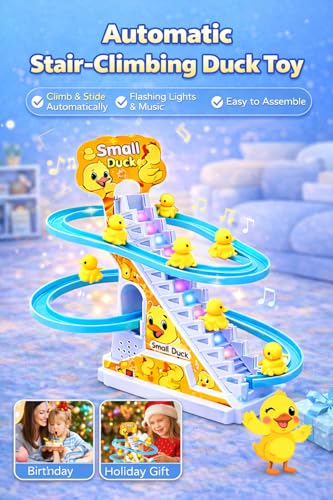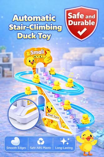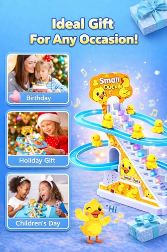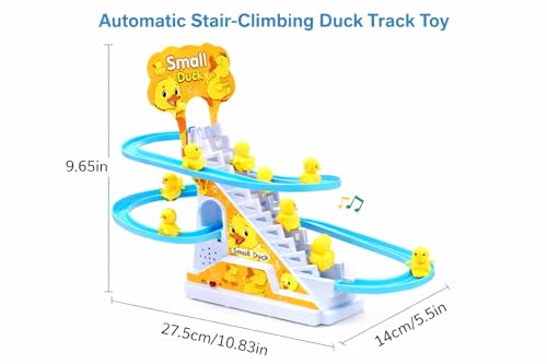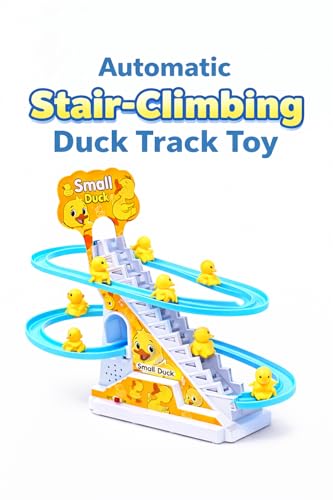 bp 1- ★ Novelty Sliding Track Toy: This toy comes with 3 lovely yellow ducks, 1 stairs part as well as 3 sliding tracks. After assembly and start the toy, the ducks will be sent to the top one by one and then slide back to the starting point for the next round.