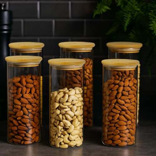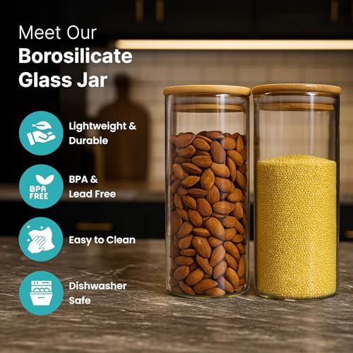 QUALITY MATERIALS: Crafted with Borosilicate Glass, Silicone, and Bamboo Wood, these kitchen containers are durable and long-lasting.