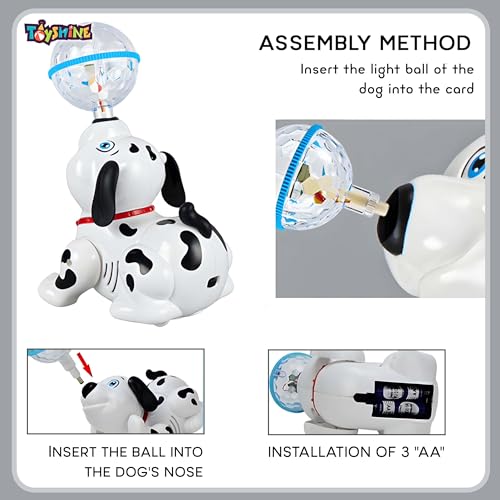 The dog toy will dance to the beat and make a light show with colorful flashing lights that children will love From the dogs eyes, to its ball and body, it is highly visually stimulating showing your baby a bunch of colors and lights – your toddler will learn about colors and have fun. This cute puppy toy can move with it’s universal wheel and change the direction if it meets barrier. Dancing, singing, barking and turn around with the lively song freely. Vibrant and brilliant lightening effect. The height of the toy is about 6 inches.