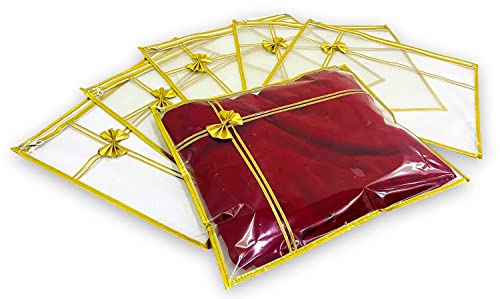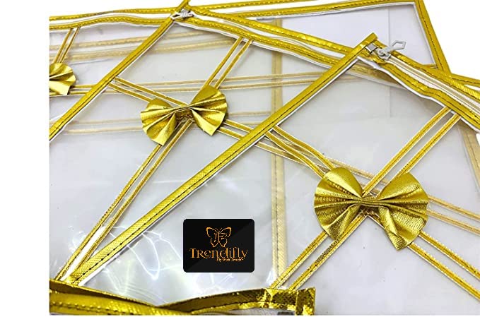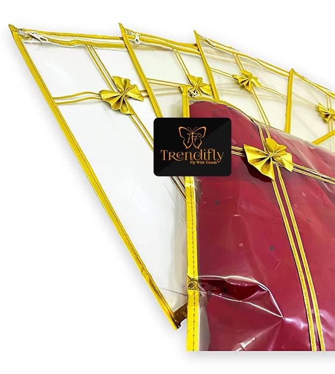 The transparent saree cover is a perfect blend of elegance and functionality. Made from durable, high-quality PVC plastic and comes in pack of 10, it features an elegant golden bow design around the borders and a premium-quality zip for secure storage. Spacious yet lightweight, with dimensions of 45 x 36 x 3 cm, it can easily hold 3-4 sarees or a heavy lehenga. Its fully transparent design makes it convenient to view the contents inside, while the golden color adds a touch of sophistication. Ideal for organizing your wardrobe, it also makes a thoughtful gift for loved ones and brides-to-be.