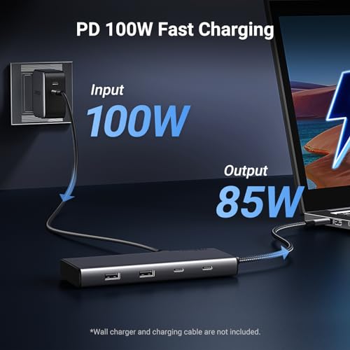 Robust 100W Power Delivery: Our Type-C hub offers up to 85W of USB-C pass-through charging via the PD port, ensuring your laptop stays fully charged while reserving 15W for seamless operation of other ports. Enjoy the convenience of high-power charging. Please note that the Type-C PD charging port is compatible only with PD-equipped devices.