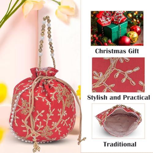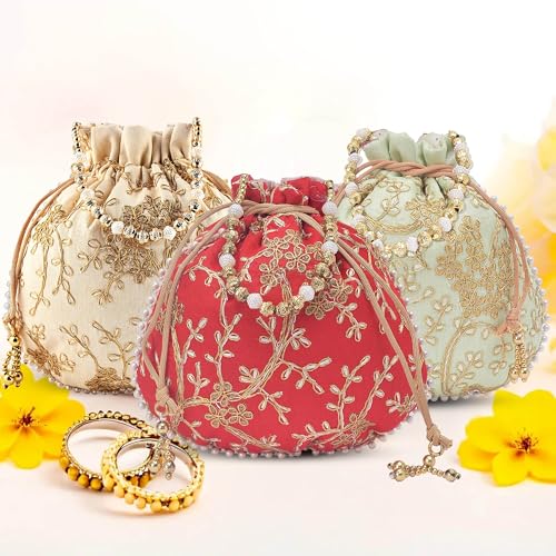 ✅ Package Contains – 3 Piece Potli Bags/Pouches for Women | Color – With Embroidery -Cream, Green & Red | Material – Polyester | Product Dimensions – 23x1x23 cm