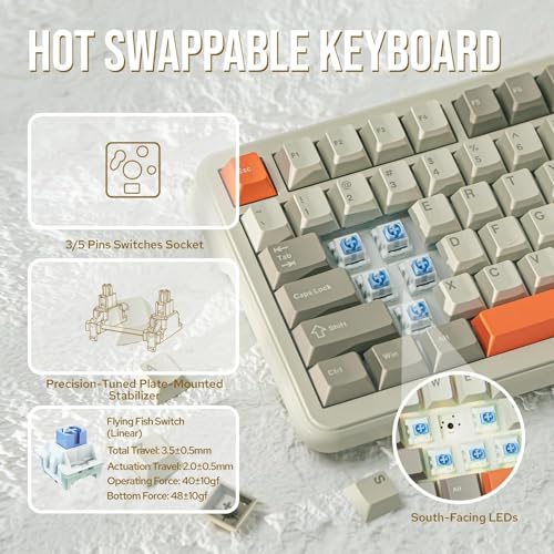 Hot Swappable Switches – Customize Without Soldering Enjoy the freedom to personalize your mechanical keyboard with 3-pin or 5-pin switch compatibility. Pre-installed linear switches provide a smooth feel, while the hot-swappable PCB allows for quick customization. The keyboard is equipped with factory pre-lubed linear Cream switches for a soft, smooth keypress.