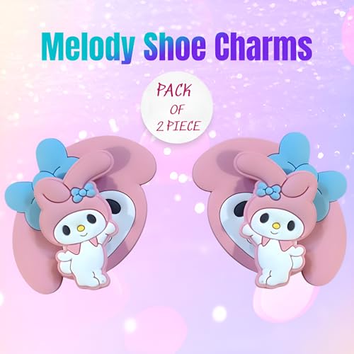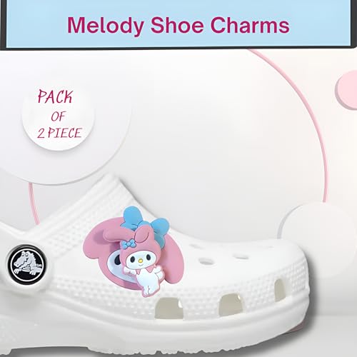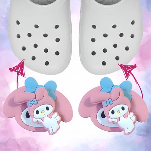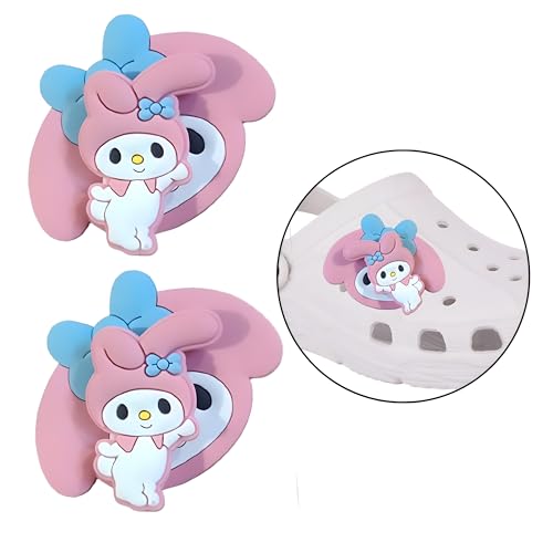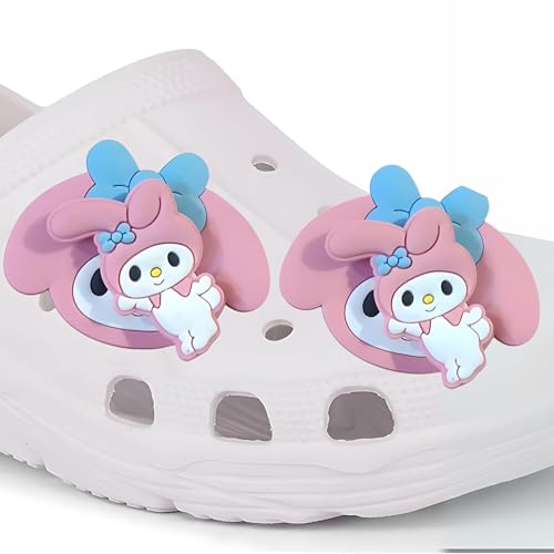 These My Melody themed shoe charms come in a pack of 2, featuring a delightful 3D design of a beloved cartoon character with blue bow accents. Perfect for adding a touch of whimsy to your clogs, they are crafted to fit securely into the holes of most standard clog-style shoes, ensuring they stay in place during wear. Ideal for both kids and adults, these charms make a fun accessory for everyday use or special occasions.