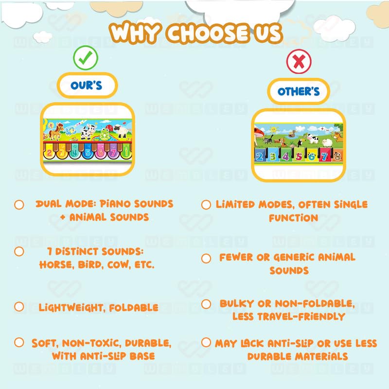 DUAL MODE WITH MULTI-SOUND EFFECTS: The Wembley Animal Piano Mat offers two exciting modes to keep kids engaged for hours. In piano sound mode, kids can press the colorful keys to create musical tunes, encouraging creativity and a sense of rhythm. Switching to animal sound mode lets children explore realistic animal calls, adding an imaginative layer to their play. The mode switch button makes it easy to toggle between melodies and sound effects, providing a dynamic and interactive experience that promotes auditory learning.