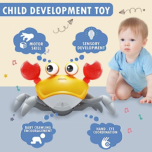 🦀 Sensing Crawling Crab: The crab toy features an electric crawl function, allowing it to move sideways and mimicking the movement of a real crab. The walking crab baby toy will start to crawl with the happy songs, when it encounters an obstacle while moving, it will move in the opposite direction, babies like to chase or crawl after it. It also can encourage babies to sit up or remain in a sitting position for a long time to play with and explore.