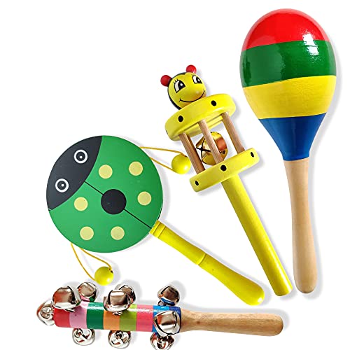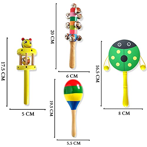PACKAGE CONTENTS : Set of 4 bright and attractive color rattle toys include Cage Bell, Jingel Bell, Egg Shaker and Drum.