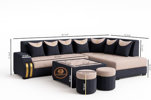 Elevate your living space with the WOODREAM Right Facing Upholstered L Shape 7 Seater Sofa Set. Crafted with luxuriousSectional Swed Fabric, this sectional exudes sophistication and comfort. Designed for hosting gatherings or lounging in style, it includes a sleek center table and two plush ottomans. Perfect for both the living room and drawing room, its right-facing configuration maximizes space and functionality. Indulge in contemporary elegance with ample seating for family and friends, while the exquisite craftsmanship ensures lasting durability. Transform your home into a haven of relaxation and refinement with this exquisite sofa set.