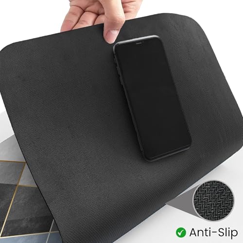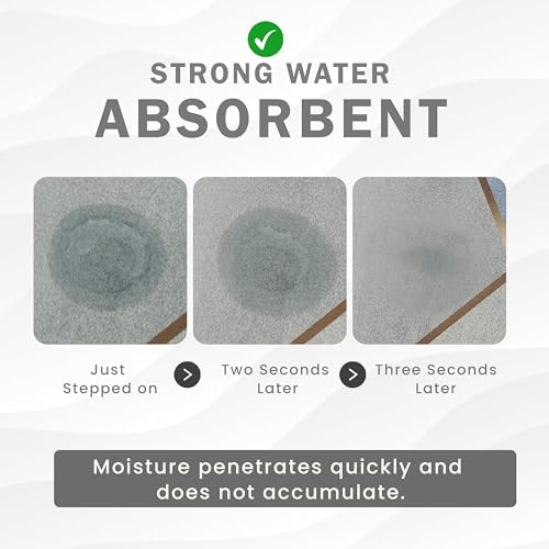 MATERIAL: Rubber Mat has 4 Layers: Soft Tech Fabric Top, Diatomaceous Earth Layer for Quick Drying, Recycled Sponge Layer for Cushioning and Non-Slip Rubber Sole Bottom for Safety in the Bathroom.