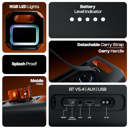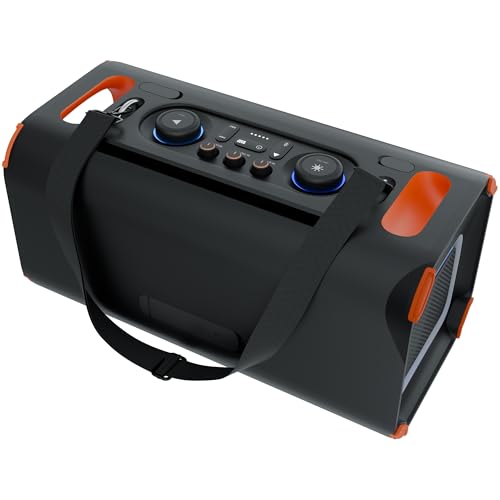 PORTABILITY: Designed for easy portability with a sturdy carry handle and detachable strap, this portable BT speaker can be taken anywhere, effortlessly, and in style.